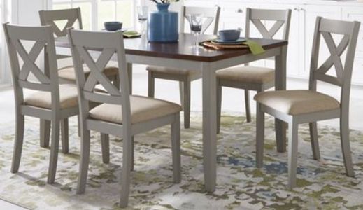 Sitting pretty with the Thornton seven-piece rectangular table set. Crafted of rubberwood solids and MDF with mango veneers, this set features a two toned grey finish with a russet top and includes six x-back side chairs and a rectangular leg table.Read More